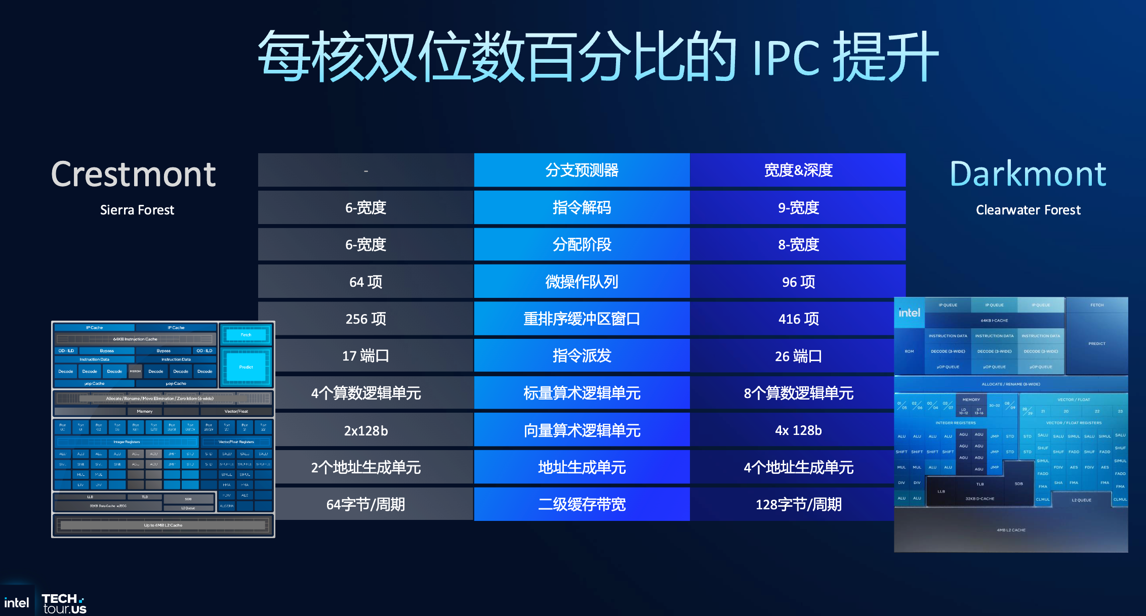 在这样一番复杂的设计操作下来,它在指令解码、分配、微操作队列、缓存窗口以及指令派发等方面都带来了30%-50%不等的提高。最终在相同功耗下,每核IPC性能相较于此前的Sierra Forest提升了17%。