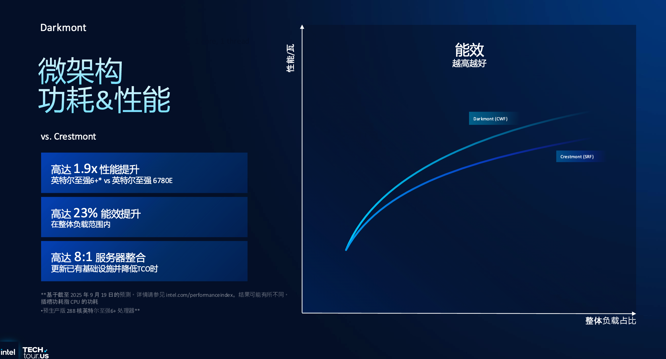 相较于此前Sierra Forest的Crestmont,现在Clearwater Forest的Darkmont核心,也就是至强6+处理器,不仅可以带来1.9倍以上的性能提升,同时,在整体负载范围之内带来高达23%的能效提升,带来服务器和机架功率降低。