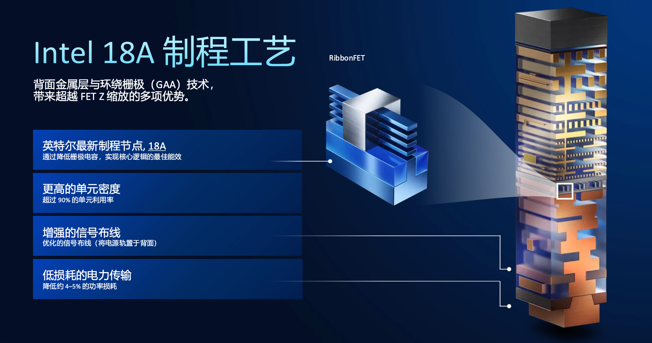 Intel 18A是业界首个将全环绕栅极(RibbonFET)与背面供电(PowerVia)两项技术同时落地的制程节点。这两项技术一个管“如何更好地开关晶体管”,一个负责“如何更高效地供电”,最终提高了核心密度和能效。
