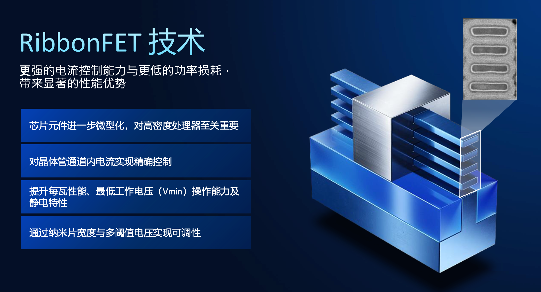 首先,RibbonFET改变了传统晶体管的二维布局方式,把沟道堆叠成了三维结构,并让栅极从四周360°包裹沟道。这种设计让晶体管实现了更好的电流控制,同时降低了漏电与功耗。简单说,RibbonFET让晶体管既能跑得快,能耗还更低。