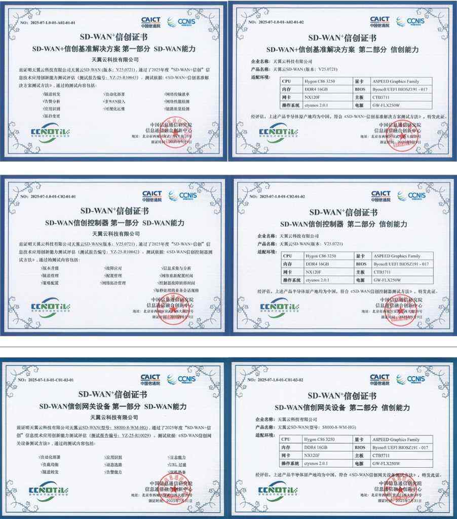 天翼云本次通过的评估模块,既包括了验证其整体功能与性能的“基准解决方案”,也涵盖了SD-WAN系统的两大核心组件——“控制器”与“网关设备”,体现了从方案到组件、从软件到硬件的全面信创能力。项目组严格依据《SD-WAN+信创基准解决方案测试方法》《SD-WAN信创控制器测试方法》及《SD-WAN信创网关设备测试方法》,对天翼云SD-WAN的全栈信创适配、协议支持、功能完备性及安全能力进行了系统化验证。