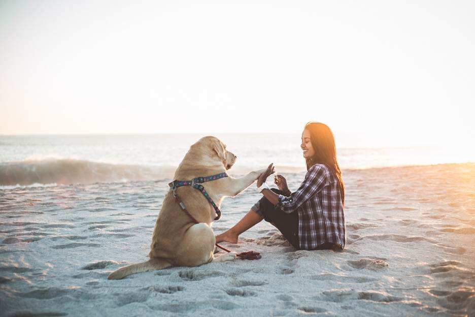 ‘This is a heartwarming, sun-drenched photograph capturing a tender moment between a woman and her dog on a beach at sunset.\n\n**Key Elements:**\n\n* **The Subjects:** A young woman with long dark hair, wearing a plaid shirt, sits on the sand. Beside her, a large, light-colored dog, likely a Labrador Retriever, sits attentively, wearing a harness. The two are engaged in a playful, paw-to-paw high-five or “pawshake” gesture, a clear sign of their bond.\n* **The Setting:** They are on a wide, sandy beach.