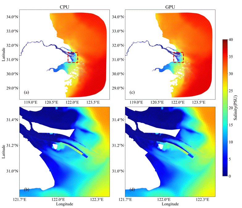 支撑FVCOM的计算架构主要采取基于CPU的多核计算节点扩展方案,即增加核数、节点,但这也提高了数值模型应用和拓展的门槛。随着GPU性能的大幅提升和日益普及,传统数值模型也在持续发展中不断进行转型和创新。面对计算量剧增的挑战,为了解决数值模型计算负载剧增这一难点问题,华东师范大学相关团队调研分析了目前主要的GPU加速计算技术,结合FVCOM模型代码的复杂度,创新开发出支持GPU加速的FVCOM模型。升级后的模型支持正压、斜压、泥沙、植被等关键模型,并支持全部外部驱动包括风场、热通量、降雨、离线流场、嵌套文件的高效传输,也可进行不同算力精度计算的自由切换。迁移后的模型相关的输入、输出和控制文件未发生任何变化,可以适用于原有FVCOM的相关应用。