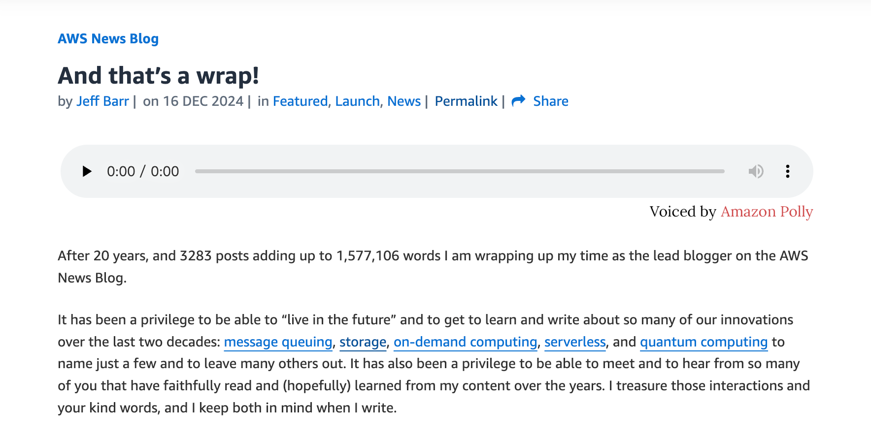 可以说,Jeff Barr用博客建立了亚马逊云科技与全球开发者沟通的桥梁和信任的基础。2024年年底,Jeff Barr宣布不再写线上博客,而是要出去,与全世界的开发者面对面交流,继续帮助亚马逊云科技延展AI技术生态。