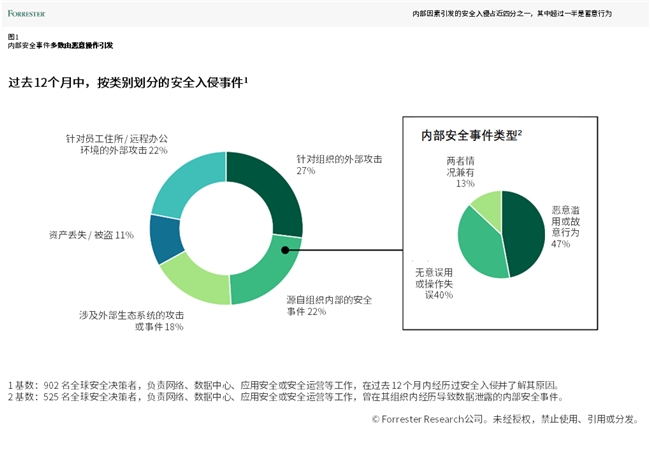 图表来源:《内部事件导致近四分之一安全入侵,超半数为蓄意行为》(Internal Incidents Cause Almost a Quarter Of Breaches, With More Than Half Intentional),Forrester,2024年3月。