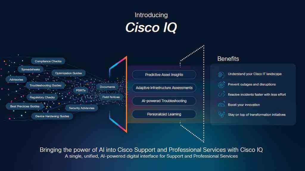 Cisco IQ作为平台的一部分,提供了预测性资产洞察,帮助客户通过直观的界面管理和评估资产。它能够识别需要关注的关键点,如资产过期或安全需求,并提供定制化的安全建议。它还通过自动化和分析工具,帮助客户形成与业务高度相关的定制报告,从而提高资产管理的主动性和准确性。