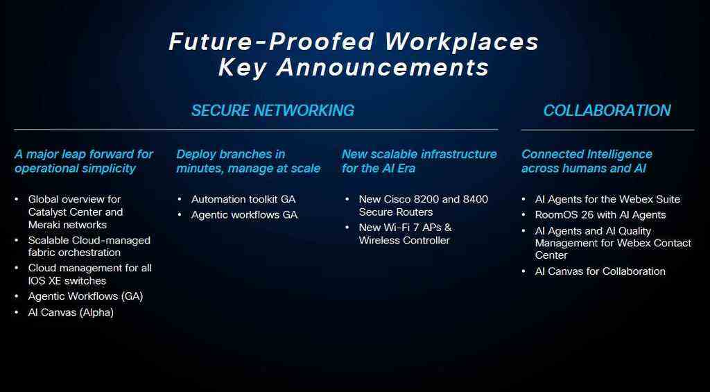在网络管理方面,借助快速实现的每个站点访问,可以获得无缝的登录体验;基础设施迁移的全过程健康、安全,风险减少至最低;低代码工作流和无代码工作层解决方案,将AI助手融入到思科工作流工具中,经过验证的各项能力经由AI代理的帮助,支持客户更快的部署,大幅减少人为错误。