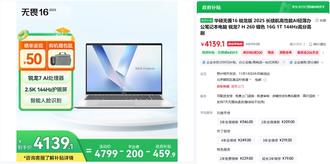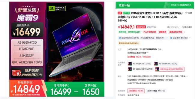 其他方面,2.5K星云屏,100%DCI-P3广色域,ROG独有的ACR超视技术,冰川散热架构3.0,影刃键盘,基本能想到的都已经拉满。现在还有国补政策直接优惠,联系客服晒单同样也送京东E卡。