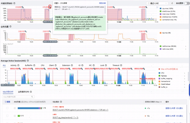 ○ 分钟级问题定位:面对CPU飙高、IO异常等复杂场景,传统排查需数小时,而DBdoctor能在1分钟内精准定位根因并提供具体优化建议