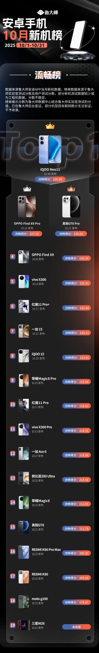 10月这波新机潮,用数据证明了一件事:旗舰芯片是真的香,但系统优化和AI能力也不能拉胯。红魔11 Pro+依靠满配硬件以及激进调度在性能榜称王,iQOO Neo11凭系统优化在流畅榜逆袭,AI榜则随时期待着新旗舰来霸榜。