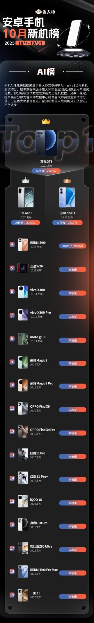 10新机AI榜,由于目前搭载骁龙8 Elite Gen5、天玑9500新旗舰手机的AI跑分波动较大,为了榜单的准确性,鲁大师后台暂时不予收录,后续恢复正常后,将在鲁大师月、季报中第一时间体现。因此本月仅收录几台上代骁龙8至尊版新机。