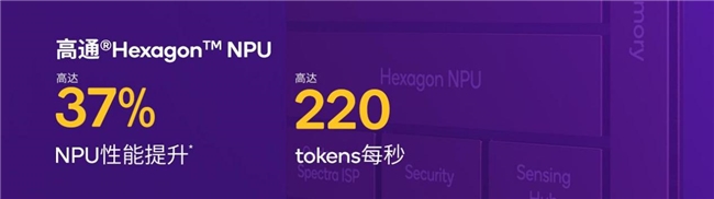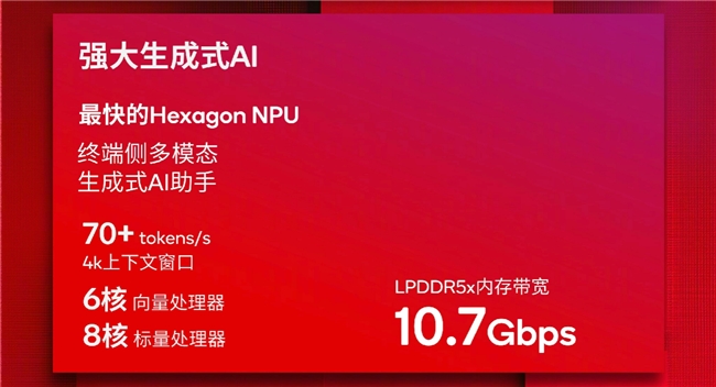 这里,咱们先回顾下骁龙8至尊版的AI能力,其AI处理器 Hexagon NPU,相较再之前的8 Gen3 AI性能提升可以说是跨越级,推理速度提升了45%,每瓦的性能表现提升了45%,支持端侧70+tokens/s的输入处理能力。