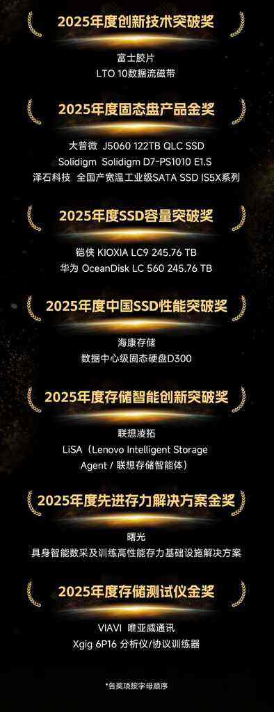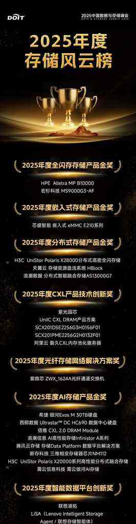 同期揭晓的“2025年度存储风云榜”,则表彰了在技术创新、市场表现、生态贡献等方面表现卓越的企业与产品;获奖名单覆盖存储芯片、介质、整机等多个层级,彰显中国存储产业链的蓬勃活力。