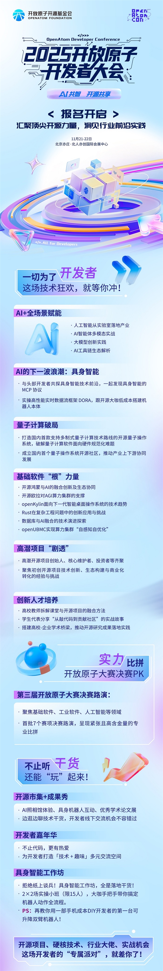 2025 年 11 月 21 日至 22 日,北京亦庄·北人亦创国际会展中心将迎来一场属于全球开发者的开源盛事——2025 开放原子开发者大会。本届大会以「AI 共治,开源共享」为主题,汇聚来自全球的开源项目、技术专家、社区领袖与一线开发者,共同探讨开源技术的未来路径与生态共建。