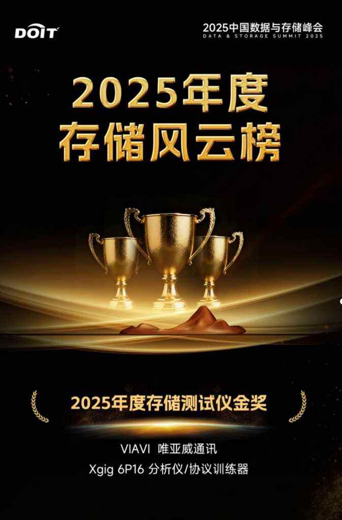 11月18日,由DOIT百易传媒主办的2025中国数据与存储峰会(Data & Storage Summit 2025)圆满落幕。大会期间重磅发布了“2025年度存储风云榜”,VIAVI Solutions(唯亚威通讯)凭借适用于 PCI Express 6.0的Xgig 6P16分析仪/协议训练器荣获“2025年度存储测试仪金奖”。