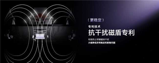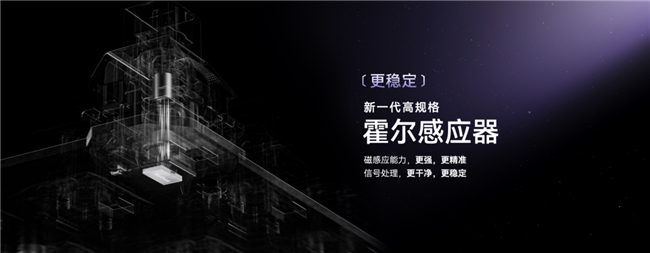 为了做到更稳定,“源点星链”方案通过 Magic 磁感优化技术,让磁通量感知提升30%,采用全新一代旗舰级的霍尔传感器,这款传感器抗温漂能力更强,噪声更低,其输出信号的抖动幅度仅2mV,远低于市面上所谓”第三代霍尔”的 11mV,还创新式带来邻键抗干扰专利技术,让键盘在游戏操作中的抗干扰性提升 60%。