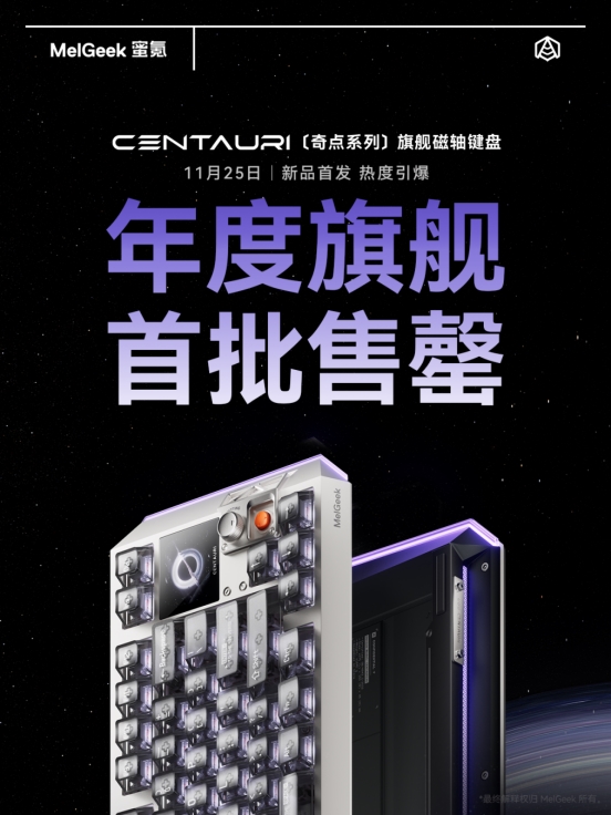 北京时间 11 月 25 日晚 19:00,以“奇点·重塑”为主题的 MelGeek 蜜氪品牌生态暨新品发布会圆满落幕。MelGeek 正式揭晓中文品牌名“蜜氪”及全新品牌视觉,并重磅发布了其自主研发的第三代磁轴方案——“源点星链”、首款搭载该方案的旗舰磁轴键盘「奇点系列」、首款旗舰电竞鼠标「荷鲁斯系列」和入耳式电竞耳机「雷达3」、多款EVA联名限定款等生态外设,此次发布会不仅是蜜氪品牌成立十一周年的里程碑,更是 MelGeek 蜜氪在「新身份、新内核、新旗舰、新生态」的全面绽放。