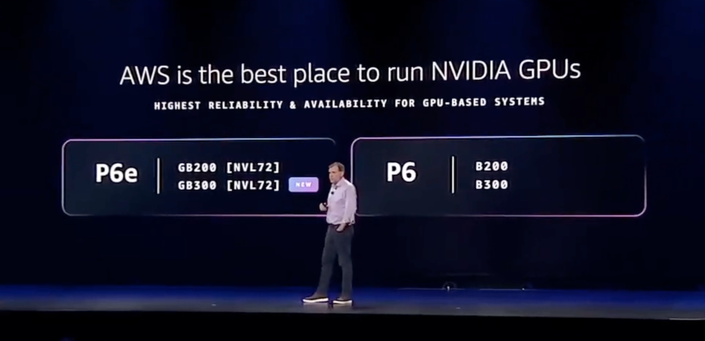 在介绍Trn3 UltraServers之前,CEO Matt Garman首先介绍了P6e-GB300实例,它的硬件是基于英伟达GB300-NVL72超级芯片构建的超节点服务器UltraServers。亚马逊云科技不只是把英伟达的GB300单纯引入,而是会一起做深度优化。