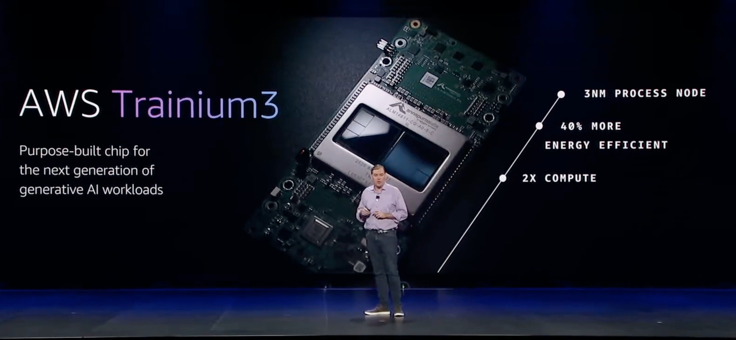 此外,亚马逊云科技还正式发布了第三代AI加速器Trainium 3,它采用了先进的3nm工艺,能效相较于上代提升了40%,算力直接翻倍,它的出现就是为了继续提升大规模生成式AI工作负载的性价比。