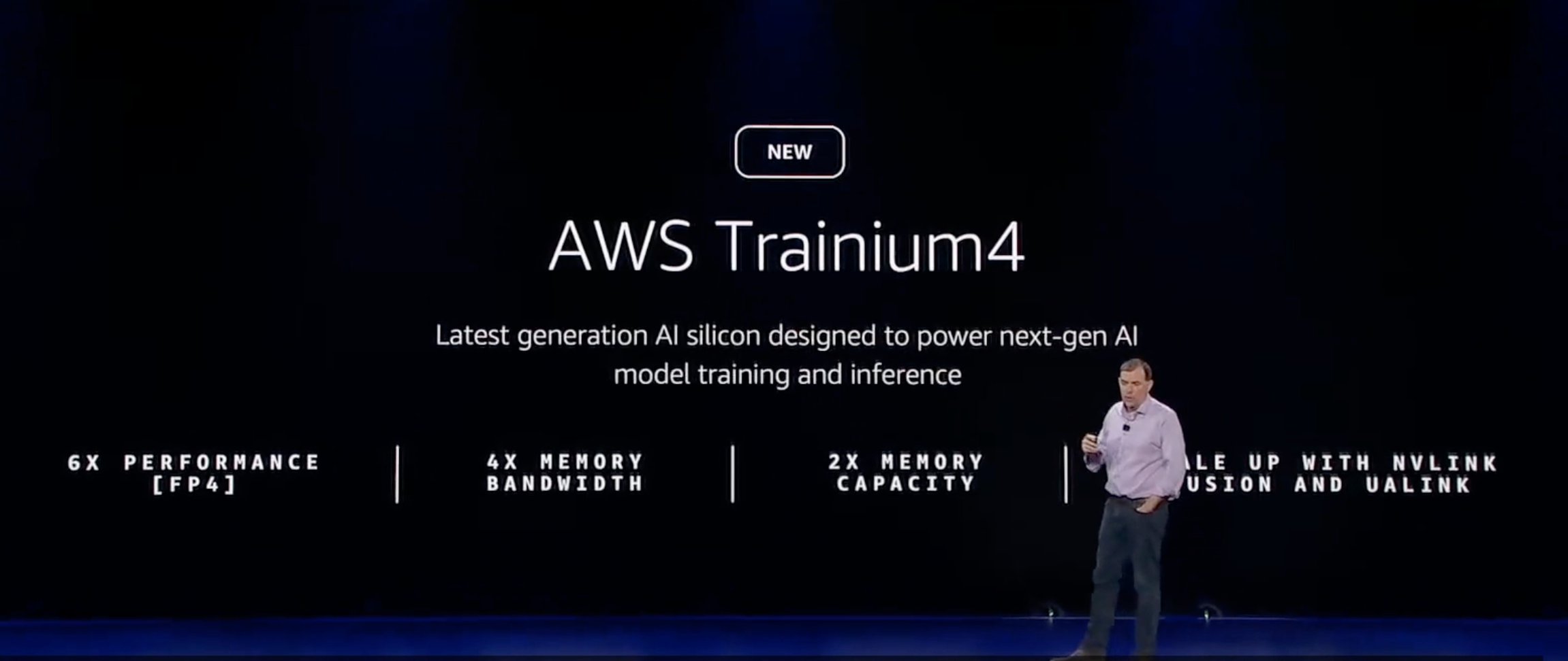 这还没有完,为了让用户进一步增加对Trainium的信心,Matt直接宣布Trainium 4的消息。相比Trainium 3,Trainium 4的FP4性能提升了6倍,内存带宽提升4倍,HBM容量增加2倍,在性能增强的同时降低能耗。