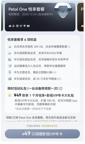 没有换新机的需求也别遗憾,现在订阅Petal One悦享套餐或尊享套餐,送你一年的影视VIP年卡,可以看华为视频和优酷的内容!开一个月也可以直接领一年!