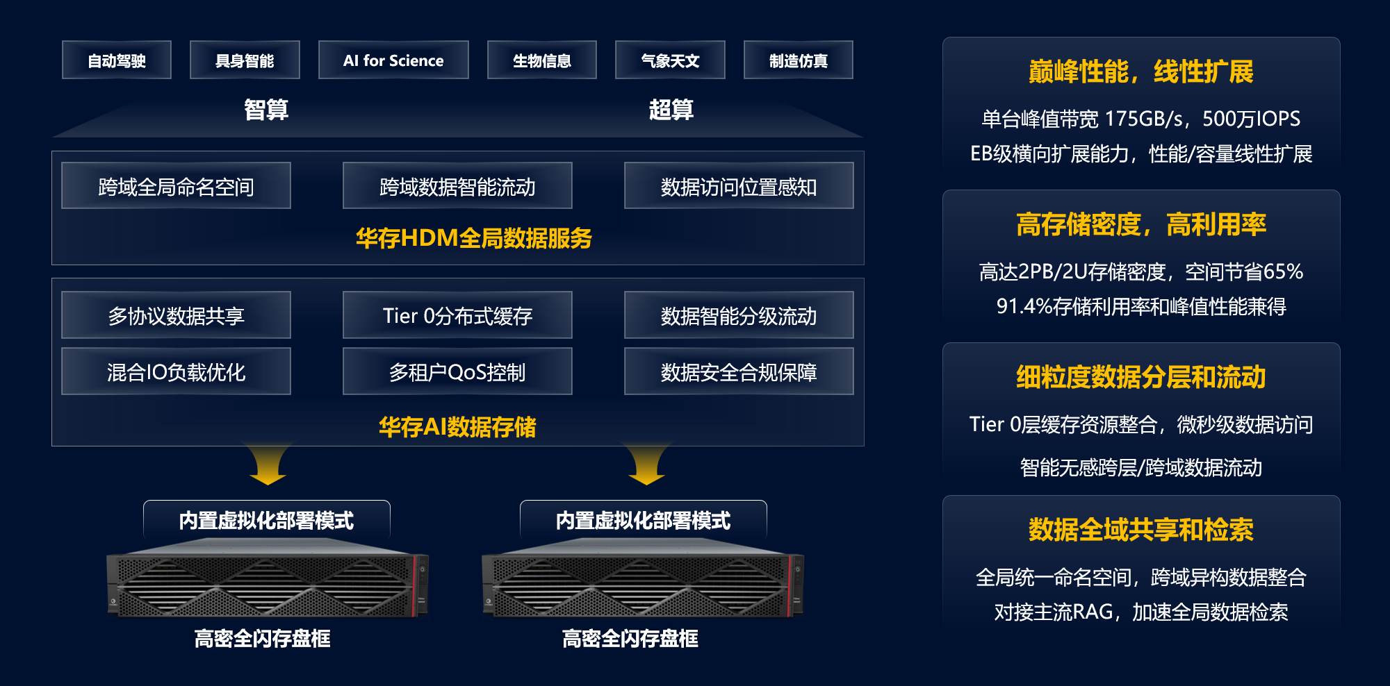 另一个案例则是西部某城市的超智算数据存力中心。项目业主和运营方特别重视数据要素的潜力,要求存力系统不光为算力集群提供高带宽吞吐,还要服务于算力资源和数据要素集中流通的一站式运营模式,数据要素流通和算力资源消纳互相促进,以算聚数,以数促算,支撑人工智能驱动的重大科技创新和新兴产业发展。华存通过HDM全局元数据服务整合这三个算力中心的同构/异构数据源,构建一个百PB规模数据统一管理视图,数据在统一安全和权限管控策略下,跨层跨域、跨业务实体流通。