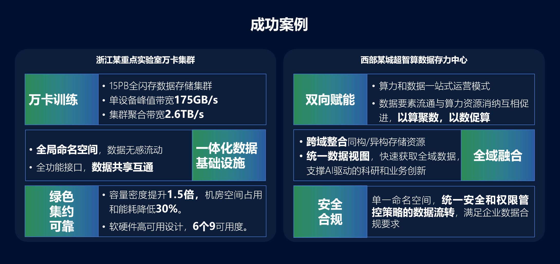 在过去两年的市场上,华存参与了全国多地的大型智算中心建设项目,与一些云伙伴推进大型智算中心的交付。自2024年至今,整体交付量已经累计达到150PB全闪AI存储。大会现场,华存智谷介绍了两个典型案例,体现华存智谷在AI时代对存储系统如何演进的思考。