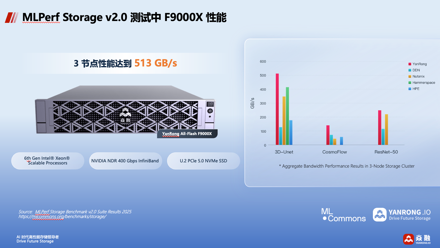 焱融的产品性能非常出色。在MLPerf Storage v2.0中,由3个节点组成的焱融全闪存F9000X集群在UNet3D测试集中创造了新的全球性能记录,在通用硬件上实现了513GB/s的超高带宽。