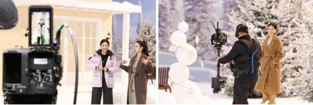 在资源配置上,将讯道系统集中用于开场秀、中场秀等对画质与机动性要求更高的环节,同时以轻量化设备覆盖标准化电商带货场景,在专业效果与成本控制之间实现了有效平衡。机位部署上,走秀环节由9机位组成,覆盖咖啡厅、室外雪景等分场景,结合远程控制系统,精准捕捉明星主播、模特的动态走秀与互动;产品讲解环节,则采用5台佳能EOS C80,实现场景的全方位覆盖,确保穿搭展示与面料细节的高品质呈现。在视觉呈现方面,得益于佳能色彩科学,保障了全流程、多机位视觉呈现的一致性。在工作流程设计上,根据不同环节量身定制技术方案——秀场环节侧重电影级表达,采用讯道系统,集合佳能镜头原厂生态优势以及广电系统无缝集成,支持复杂运镜,产品讲解环节则以效率为先,轻量化系统在保证画质的同时提升执行敏捷性。