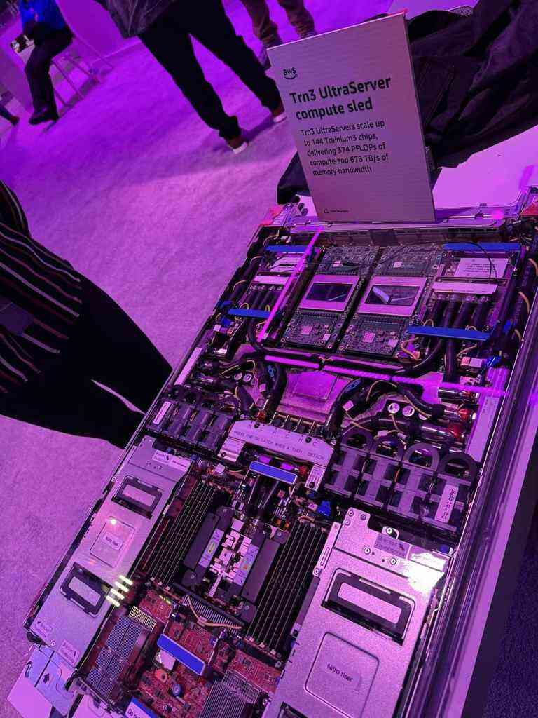 在大会现场展区近距离观察可以看到,这大概是1U规格的液冷服务器,服务器里密密麻麻的有各种零件,空间利用率非常高。当这样36台服务器堆在一起,然后通过Neuron Switch把Trainium3连起来之后,就组成了EC2 Trn3 UltraServers实例。(注:NeuronLink是负责连接Trainium芯片的专有协议)