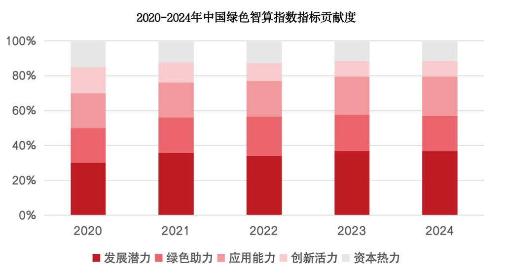 从各指标贡献度来看,发展实力、应用能力指标贡献度持续提升,绿色智算各领域有较大增长空间。2024年发展实力、应用能力指标贡献度分别较基期上升7个、3个百分点,表明规模扩张和场景拓展成果显著,对绿色智算的可持续发展发展起到重要作用,为未来跃升奠定坚实基础。五年来,绿色助力指标贡献度波动中基本稳定在20%,表明绿色与智算整体实现了协同发展,匹配度较高。创新活力与资本热力指标经历调整,绿色技术创新转向体系化系统化,绿色智算上市企业的发展理念从规模扩张转型为质量优先。