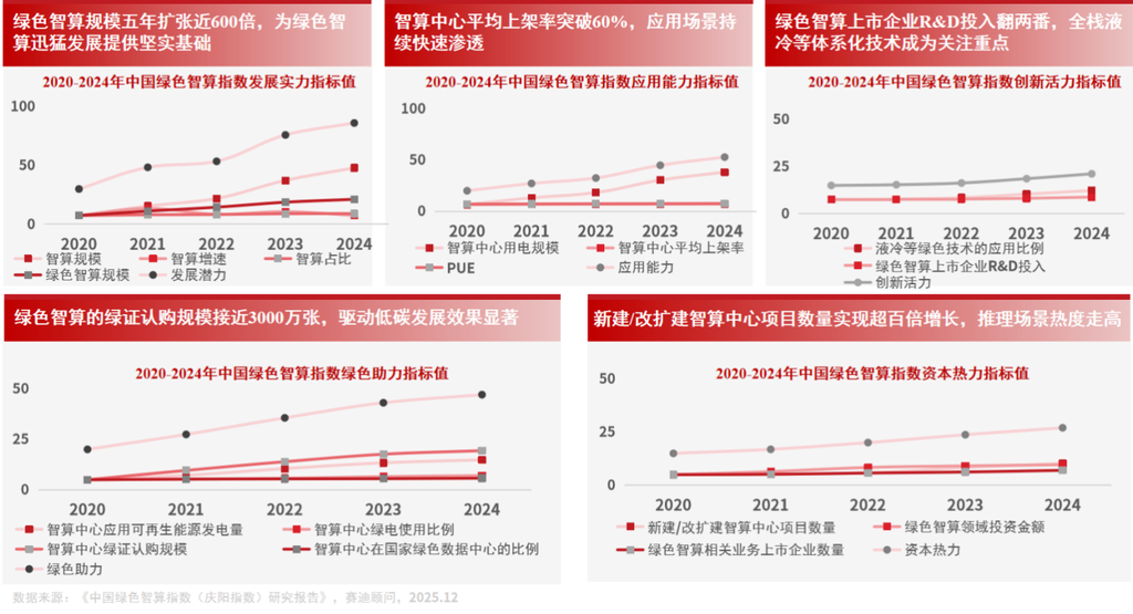 从细分指标来看,五年间,中国绿色智算产业多指标实现高速发展,展现出强劲的增长动能和巨大的未来潜力。五年来,绿色智算规模、智算中心项目数量分别激增近600倍与100倍,助力发展实力、资本热力指标表现突出。绿证认购规模逼近3000万张大关,绿色智算上市企业R&D投入翻两番,分别指向绿色助力与创新活力的澎拜活力。智算中心平均上架率突破60%,应用场景持续快速渗透,表明应用能力持续向好,未来空间广阔,潜力巨大。