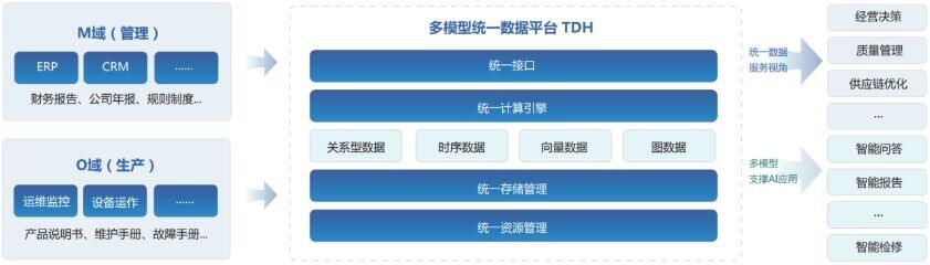 TDH强大的多模型能力使其成为一个真正“AI-Ready”的数据平台。通过整合管理域(M域)和生产域(O域)的数据,TDH能够构建统一的数据服务视角,为AI大模型应用提供高质量、多维度的训练和推理数据。这在实践中意味着打破了传统分析型系统(如ERP、CRM)与生产型系统(如物联网设备数据)之间的壁垒,创建了一个统一的数据基础,使AI模型能从企业全业务流程中获取洞察,而非仅仅是孤立的数据片段。这种一体化支撑“AI × Data”场景的能力,帮助企业将沉睡的数据资产转化为可用于大模型的知识,从而全面释放数据价值,加速AI应用的落地。