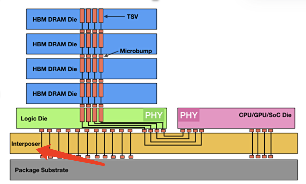 传统DRAM通过板级(board-level)方式与芯片连接,带宽瓶颈明显。HBM的出现让这种连接方式发生变化——它通过interposer(硅中介层)把CPU和堆叠DRAM密集互连,就像在CPU旁边增加了一个带“凹槽”的底座,让多层显存能稳稳地堆上去。HBM是把多个DRAM芯片垂直堆叠,通过TSV实现超高带宽。