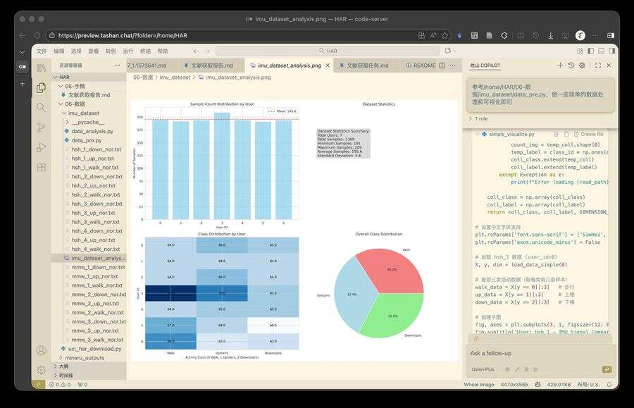 例如中国科学院大学电子信息专业研二的周同学在研究时间序列信号处理时,只需一句指令:“调研最新进展并分析一个典型公开数据集”,他山•科研IDE便自动完成全流程:检索近年论文并总结方法趋势;下载公开数据集至本地;生成可运行Python脚本,实现数据加载、预处理、特征提取与可视化(如时域、频谱、分类效果);并将结果嵌入调研报告。从想法到可验证结果,全程无需切换工具或手写代码,仅需15分钟。