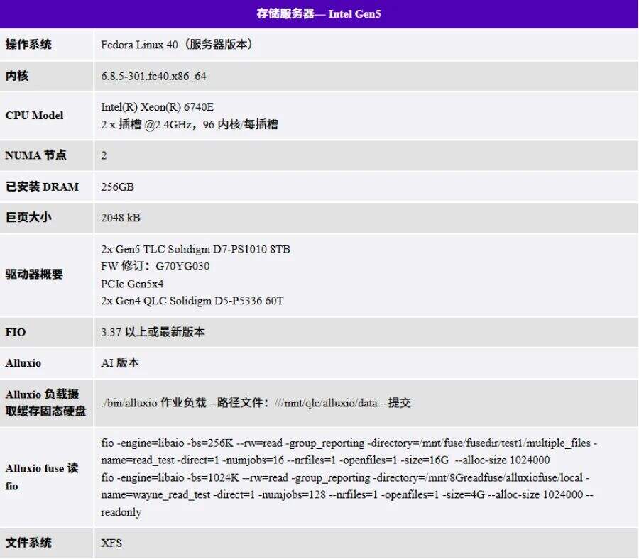 为了快速部署并展示 Alluxio 存储引擎的强大性能,我们设置了一个单节点测试环境值得注意的是,Alluxio 的最大优势在于其能够利用主机端的分布式复制缓存,随着 GPU 的扩展而扩展,并显著降低南北向存储带宽的开销。即使在单节点配置下,Alluxio 也表现出超高的效率,尤其是在搭配高性能 NVMe 固态硬盘时。对于此测试,我们将缓存配置为PCIe 5.0 TLC 或 PCIe 4.0 QLC,而底层文件存储 (UFS) 使用 PCIe 4.0 QLC。