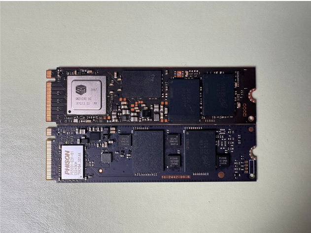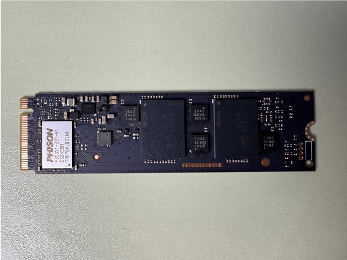 撕开表面的贴纸,我们可以看到P510采用了单面PCB布局。这种设计对于笔记本电脑以及PS5用户来说非常友好,不用担心底部元件带来的安装兼容性问题。相较于T710,P510上的元器件数量少了很多,看起来也比较清爽。