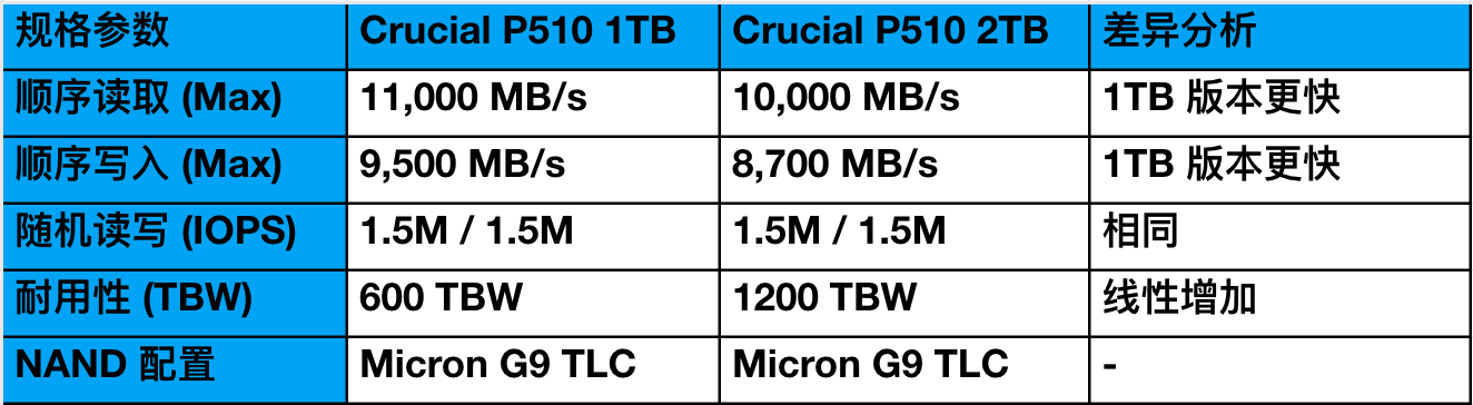 Crucial P510有1TB和2TB两个版本,两个型号的最大读写IOPS数据都是150万,很均衡。但最大顺序读写性能有差异,与以往不同的是,1TB版本的性能反而比2TB还要高,这可能也是为了控制温度采取的策略。