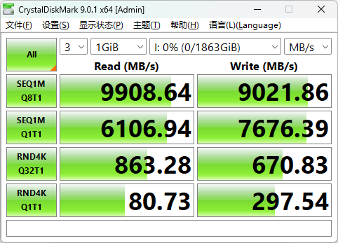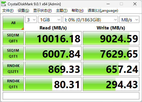 我们首先使用CrystalDiskMark来看看跑分数据,CrystalDiskMark测出来的数据偏向理论峰值性能,尤其是顺序读写成绩。同时,通过4K随机读写也能大致反映日常使用的体验。