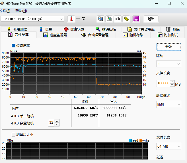 众所周知,现代SSD普遍都会用模拟SLC的方式来优化峰值性能,而HD Tune Pro经常用来测试SSD真实性能底色的神器。在我们的测试中,我把数据模式设为随机模式,而不是原来全写零的模式,这样可以避免压缩带来的影响,展示真实性能。
