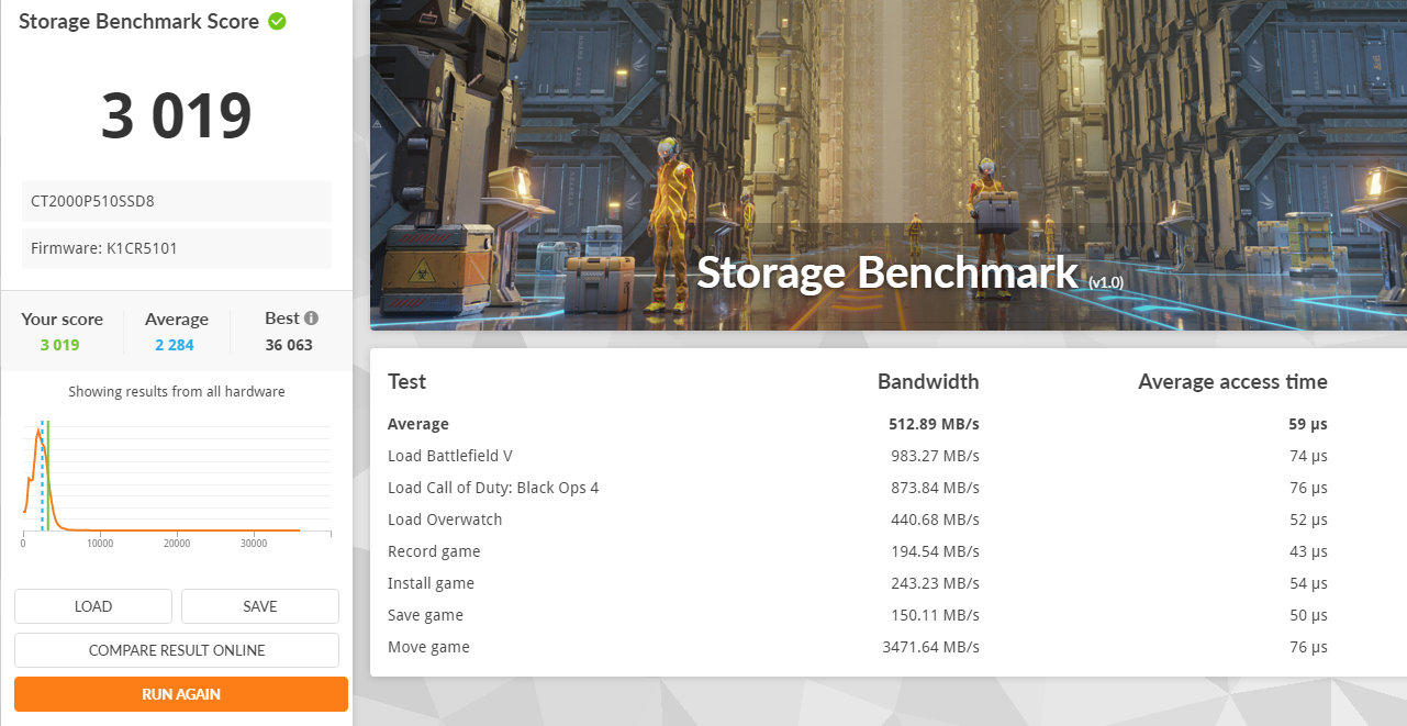 为了模拟真实的游戏加载场景,我们运行了3DMark Storage Benchmark。在真实游戏模拟考中,P510用3019的好成绩证明了自己是一块拒绝高分低能的实战利器,得分远超平均得分数。