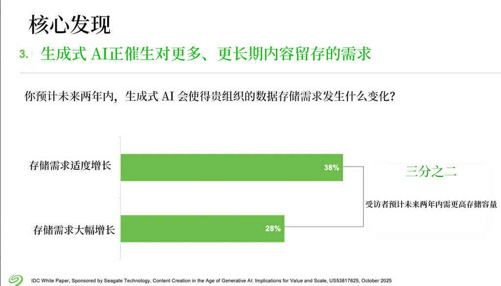 在边缘场景,AI赋能的视频创作、工业质检和医疗监控领域,AI不仅提供分析能力,还会生成基于事件触发的视频片段和结构化元数据,为了减少带宽占用并降低延迟,这些数据都需要在边缘场景处理,希捷魔彩盒HDD则提供了海量数据的蓄水池。