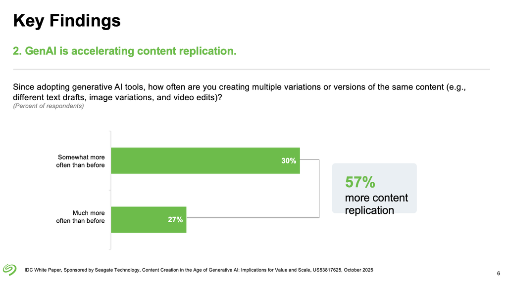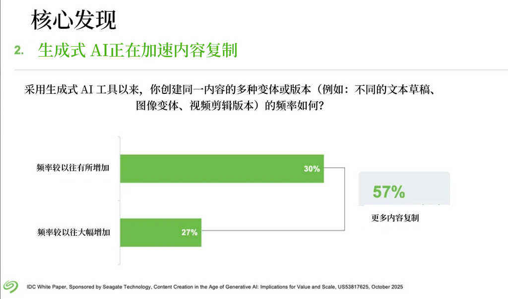 报告还发现,生成式AI技术会让文件衍生出更多变体。比如,市场团队会用A/B测试来验证创意效果,设计人员会把迭代的版本也留下来。因此,有57%的企业表示,在采用生成式AI之后,同一内容资产的变体数量明显增加。