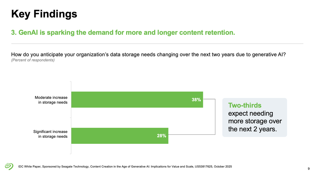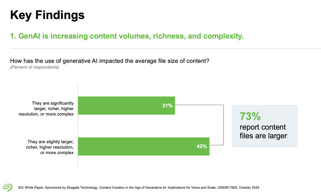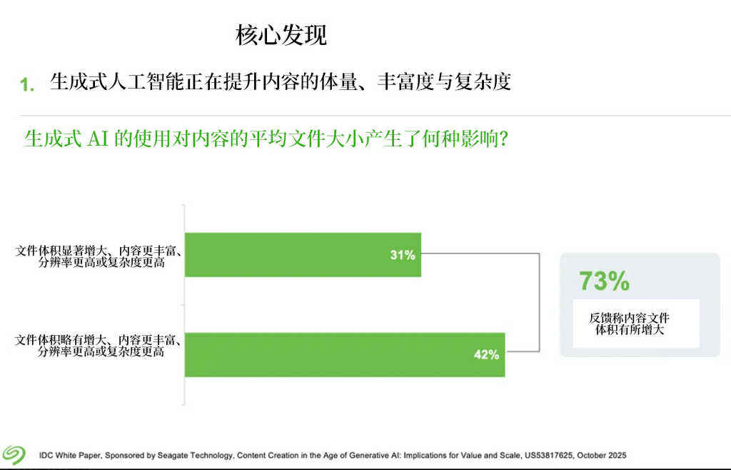 由于生成的内容有更多图片、视频等内容形式,因此会占据更多存储空间。报告提到,有73%的受访者表示,他们的平均文件变得更大了,其中有约三分之一的人表示,文件体积增长非常明显,这些都给存储带来了压力。