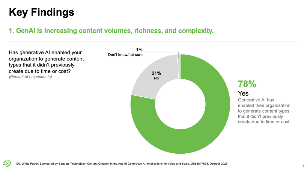 IDC的这份报告叫《Content Creation in the Age of Generative AI》,报告还提到,有78%的受访者表示,生成式AI让他们创作出了以前因为太费时间或者成本太高而无法制作的内容,比如,生成3D产品展示、AI增强的培训模拟场景等。