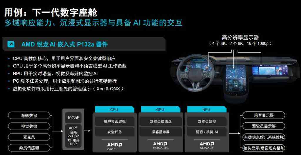 在汽车应用方面,基于Zen5架构的嵌入式处理器主要负责控制逻辑器件,以4K质量的图形实现驾驶员的屏幕以及乘客屏幕的控制,NPU实现实时的语音和视觉,包括提醒短语或直接通过手势完成。另外,PC级别的多种任务并行的功能实现了所有供应商的市场兼容。