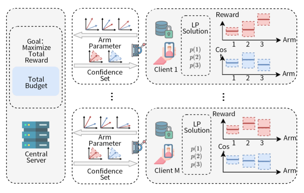 《Budget-Constrained Federated Bandits for Mobile Applications》,则聚焦智算网络跨域协同的核心痛点。针对分布式学习中“资源受限、数据隐私保护”的双重需求,天翼云首次将带预算约束的线性老虎机模型引入联邦学习,提出高效算法FedUCBwK。