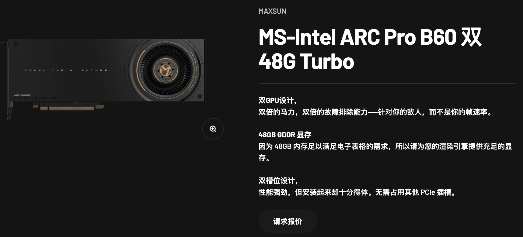 或许是看到了这一痛点,英特尔带着一张有24G显存,售价5000多人民币的锐炫Pro B60专业显卡杀入市场,今天将开始在蓝戟、铭瑄渠道上市,结结实实的成了显存价格屠夫,为那些想以更低成本在本地部署推理模型的人(企业)带来了极具诱惑力的选择。