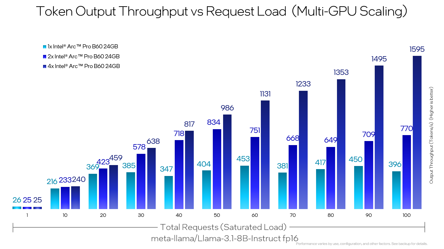 这说明,仅需四张英特尔Arc Pro B60,显卡成本大约2万人民币,就完成了原本需要一张售价约为20多万的H100(80G),或者一张售价6万多的RTX PRO 6000(96G)才能做到的事情。