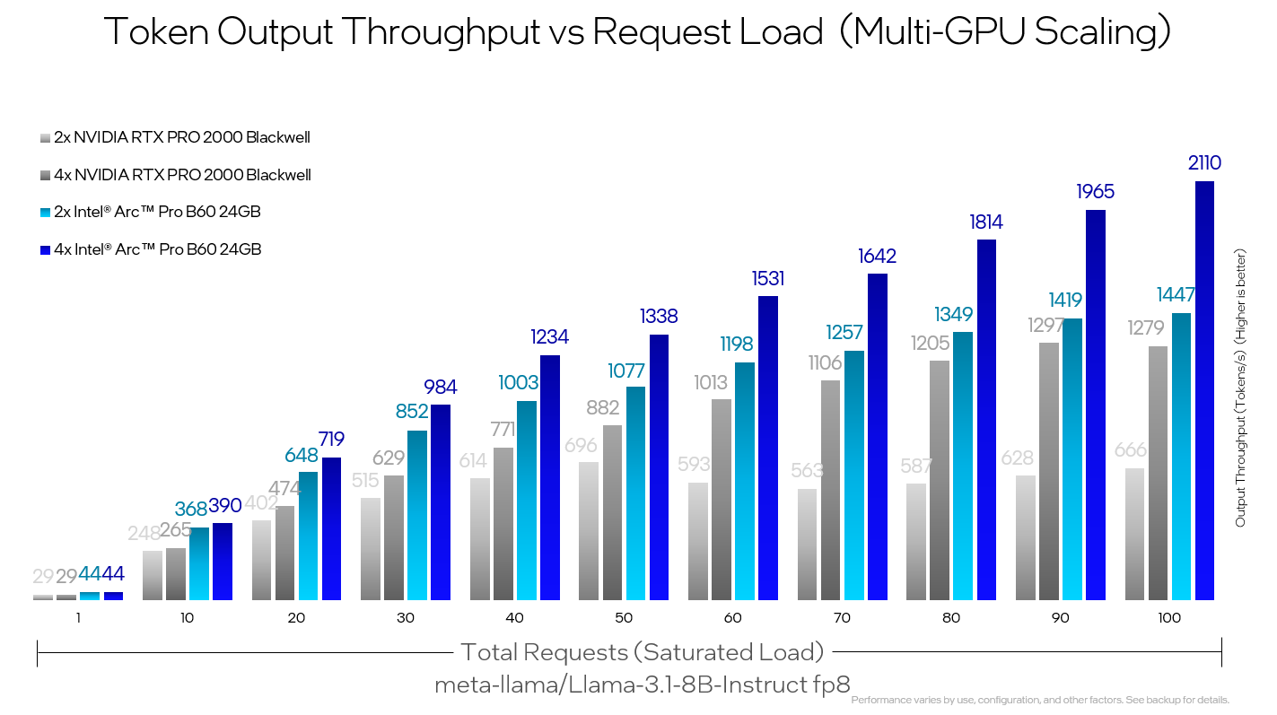另外一张图也非常有意思,展示了2/4张B60和2/4张RTX Pro 2000(16G)在推理Llama-3.1-8B-Instruct FP8时的性能表现。我们可以清楚的看到,2块英特尔Arc Pro B60的性能也稳稳超越了4张英伟达RTX PRO 2000的表现。